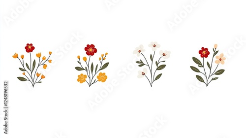 Four distinct floral arrangements featuring colorful flowers and leaves on a white background