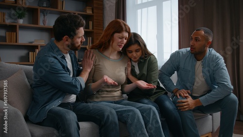 Four diversity friends at home party consoling crying woman talking about problem bad news breakup fired lost job multiethnic team buddies men women supporting cuddling group psychological friendship
