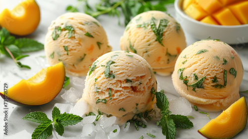 Four Scoops of Ice Cream With Mint and Mango Slices