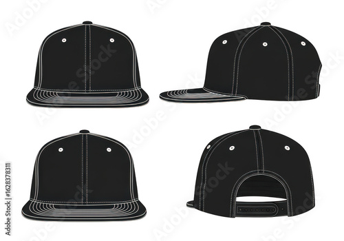Four views of a black baseball cap isolated on transparent background