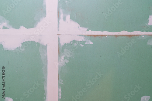 Fragment of a green plasterboard wall at the time of construction or renovation. Filled, criss-crossing seams are visible. Texture.