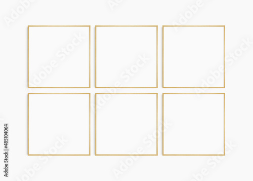 Frame mockup 1:1 square. Set of six thin oak wood frames. Clean, modern, minimalist, bright gallery wall mockup, set of 6 square frames.