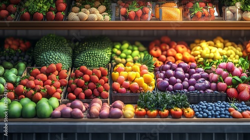 Fresh and Vibrant Organic Fruits and Vegetables at a Farmer's Market Stall, Showcasing Nutritious and Colorful Produce for Healthy Eating, Clean Lifestyle, and Antioxidant-Rich Diet with Broccoli