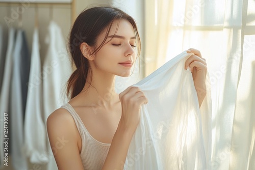 Fresh Clean Laundry Comfort Woman Smiling Touching White Shirt Natural Light Calm Atmosphere Happy Asian Girl Doing Household Chores