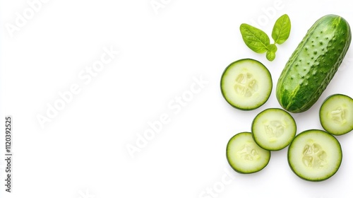 Fresh cucumber slices with a whole cucumber and mint leaves.