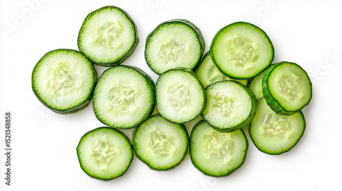 Fresh, green cucumber slices isolated on a white background, perfect for a healthy salad ingredient