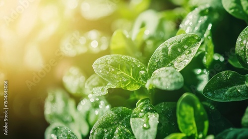 Fresh Green Spinach Leaves with Dew Drops