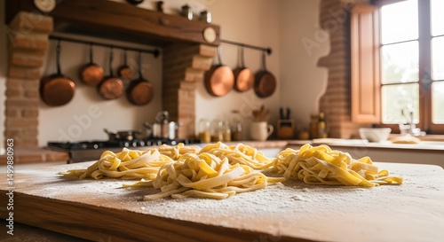 Fresh Homemade Tagliatelle Pasta on Wooden Board in Rustic Kitchen