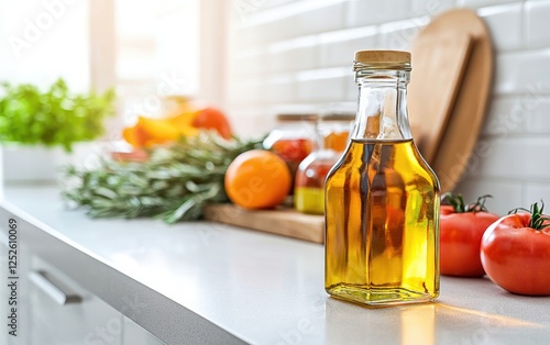 Fresh Olive Oil in Glass Bottle Surrounded by Colorful Vegetables and Herbs on Kitchen Countertop