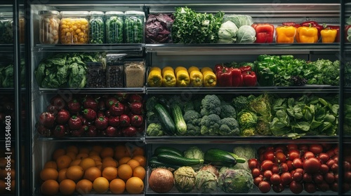 Fresh produce displayed on shelves in a refrigerated grocery section.