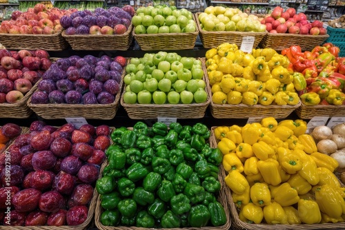 Fresh produce displays in woven baskets