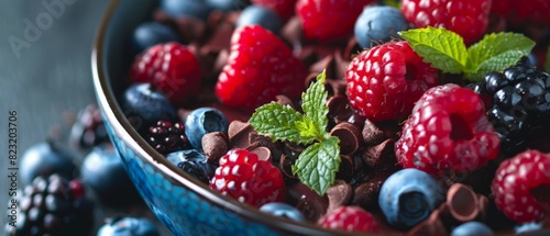 Fresh raspberries, blueberries and blackberries in blue bowl with mint leaves.