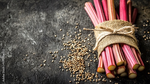 Fresh rhubarb tied in a burlap wrap, styled against a rustic backdrop with scattered seeds