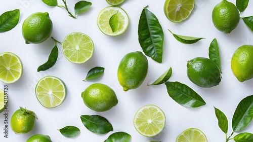 Fresh ripe limes with green leaves on a white background both whole and sliced arranged in a flat lay