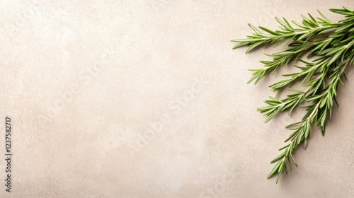 Fresh rosemary sprig on clean beige table, adding touch of nature