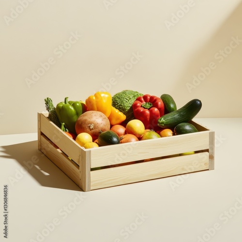 Fresh Seasonal Fruits and Vegetables in a Wooden Crate Display