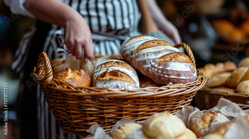 Freshly baked bread being served into wicker basket