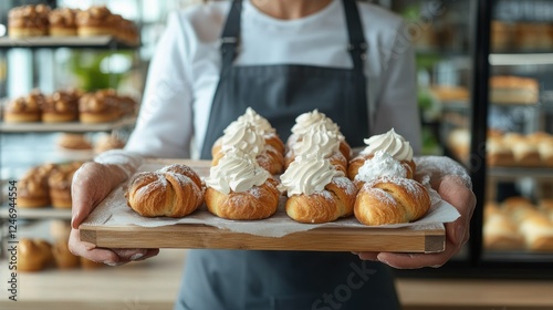 Freshly baked pastries displayed on a wooden tray at a cozy bakery with a warm atmosphere in the morning sunlight