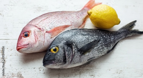 Freshly Caught Raw Fish Duo with Zesty Lemon on Rustic White Wood.