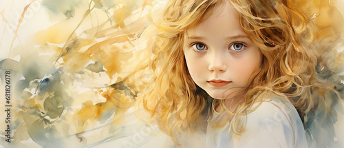 Friendly big eyes of a child: Dreamy Watercolor. Non-existent person.