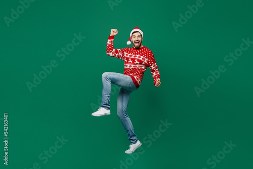 Full body side view fun merry young man 20s wear red warm knitted sweater Santa hat posing do winner gesture isolated on plain dark green background studio. New Year 2023 holiday celebration concept.