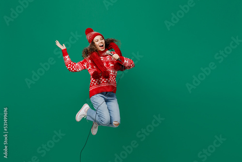 Full body singer merry young woman wear red warm cozy knitted sweater hat posing jump high sing song microphone isolated on plain dark green background Happy New Year 2023 celebration holiday concept.