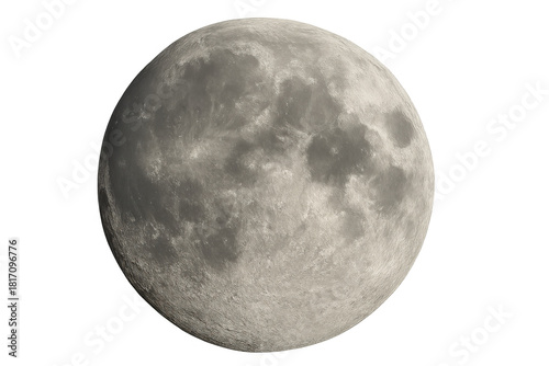 Full moon showing detailed lunar surface with craters and maria, celestial body on transparent background
