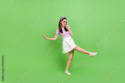 Full size photo of sweet young brunette lady dance sing wear band glasses t-shirt skirt shoes isolated on green background
