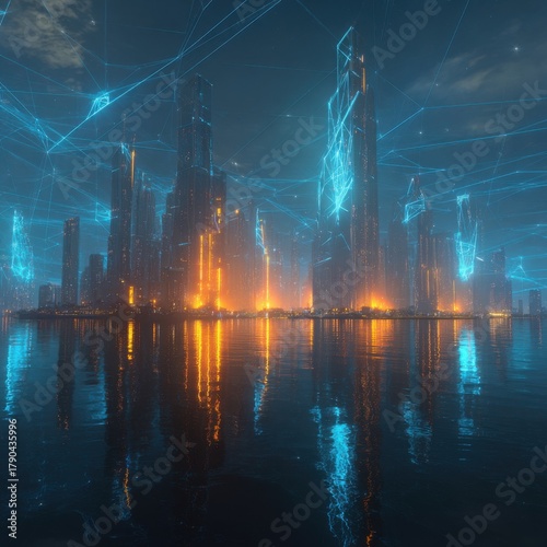 Futuristic city skyline with glowing lights and water reflection at night