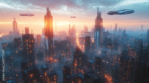Futuristic Cityscape with Flying Vehicles at Sunset