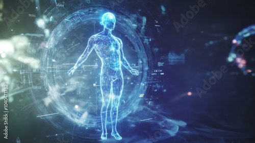 Futuristic holographic figure representing human form in a digital environment with glowing elements and data visuals.