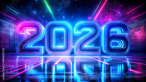 Futuristic neon sign displaying the year 2026 with vibrant light trails and reflective surface