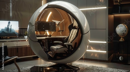 Futuristic spherical workstation with computer in modern interior.