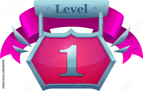 Game level 1 badge for GUI interface popup banner with pink red ribbon, vector icon. 1 level up badge with for video game arcade, first level achievement or gamer popup congrats on metal shield wings