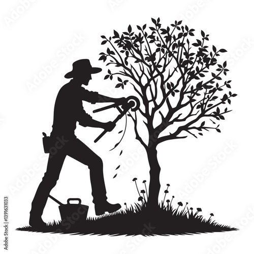 Gardener Silhouette Pruning Tree Skillfully with Clippers Outdoor Care Vector