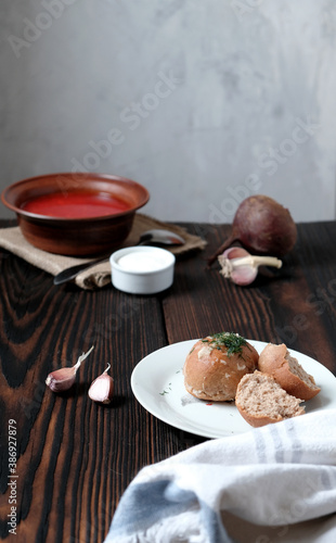 Garlic wholegrain donut and beetroot soup (borscht) with sour cream. Traditional ukrainian, russian soup on the wooden rustic table. Banner or menu recipe