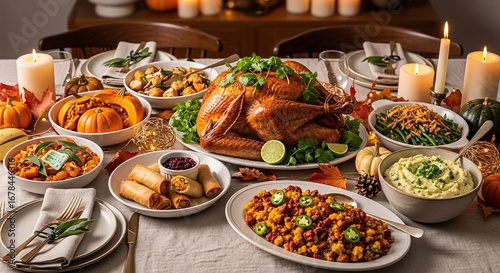 Gather for a delicious Thanksgiving feast featuring a golden roasted turkey, seasonal sides, and warm autumn ambiance