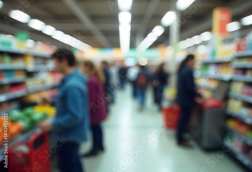 Generative AI image depicts blurred shoppers in a vibrant supermarket aisle