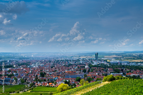 Germany, Fellbach city houses and roofs from above kappelberg vineyards in summer while rain going down over the city centre