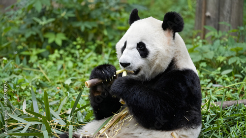 Giant panda munching bamboo shoots in lush green habitat natural daylight