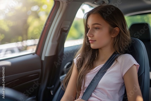Girl in her early teens is captured fastening her seatbelt in a vehicle, highlighting the importance of car safety