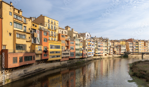 Girona Riverfront Buildings with Varied Facades and Reflections