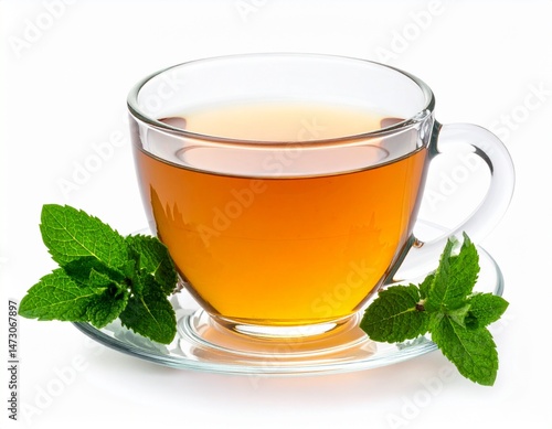 Glass cup filled with golden tea, garnished with fresh green mint leaves on a glass saucer