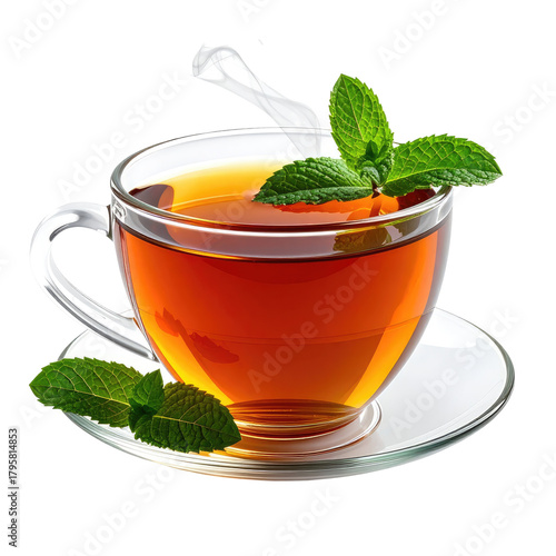 Glass cup with amber tea and mint leaves on saucer