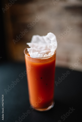 Glass of Bloody Maria cocktail decorated with rice crisps. Top view.