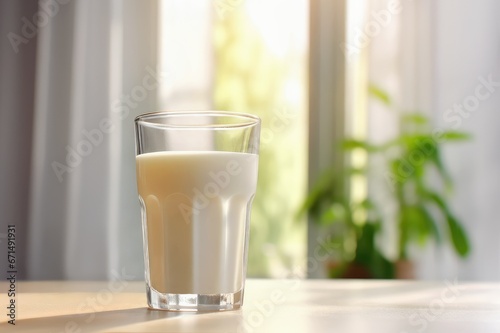 glass of milk on table at kitchen with window on the background