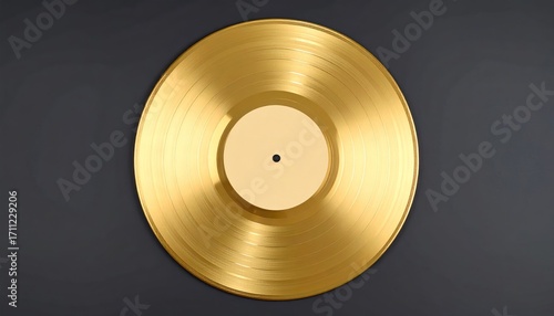 Gleaming gold vinyl record on a dark surface. Center label is blank. Grooves catch the light. Smooth background gives a modern feel