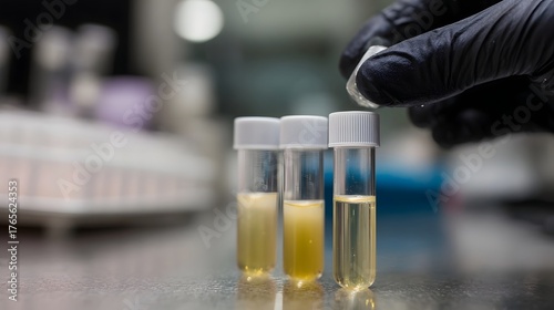 Gloved hand holding a crystalline substance over laboratory test tubes with yellow liquid