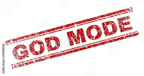 GOD MODE seal stamp with grunge texture. Red vector rubber print of GOD MODE title with dirty texture. Text title is placed between double parallel lines.