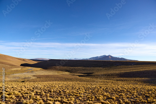 Golden dry grass covers the undulating terrain of Bolivia's Altiplano. Long shadows stretch across the land towards distant peaks under a clear sky.